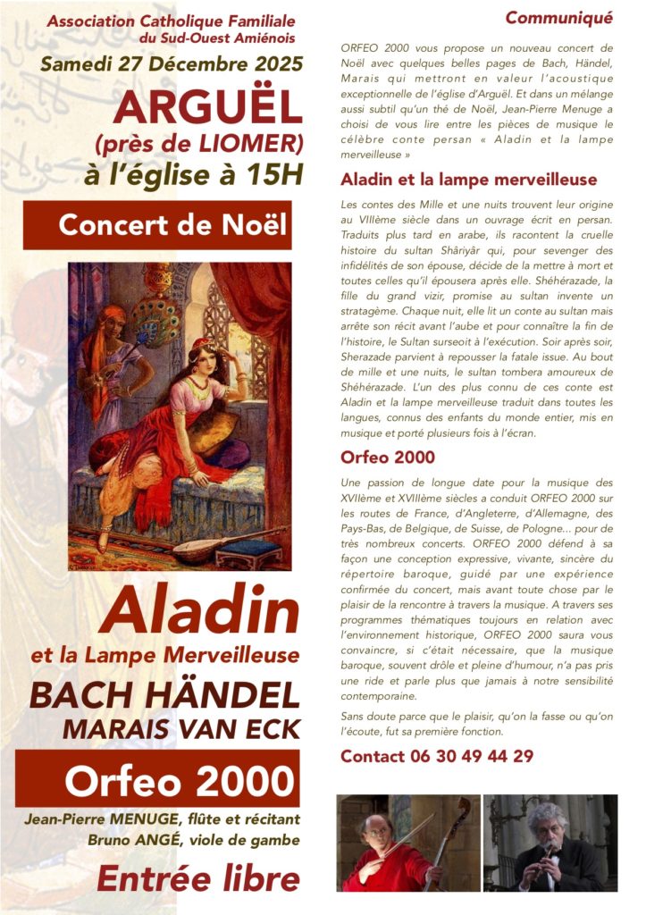 (80) samedi 27 décembre 2025 15h Eglise d’Arguel, j’accompagnerai JP Menuge sur son spectacle « Aladin »